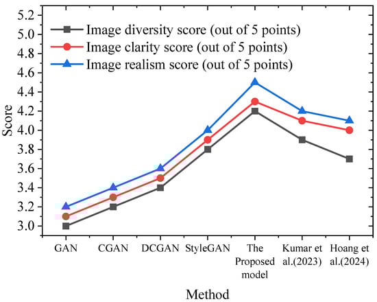As depicted in Figure 10, the proposed model outperformed traditional methods such as GAN, CGAN, DCGAN, and StyleGAN, along with the approaches outlined in the literature [34,35], across the image diversity, clarity, and realism metrics. Specifically, the method in study [34] achieved an image diversity score of 3.9, an image clarity score of 4.1, and an image realism score of 4.2, while the method in study [35] achieved a diversity score of 3.7, clarity score of 4.0, and realism score of 4.1. Despite these methods showing strong performance in terms of visual effects, a clear gap remains when compared to the proposed model.