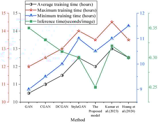 As illustrated in Figure 11, the proposed model maintained a training time distribution comparable to the other methods, with an average duration of 12 h, a maximum of 13.5 h, and a minimum of 10.5 h, demonstrating stable computational requirements. Although the training time slightly exceeded that of traditional GANs and their variants, this increase is closely associated with the model’s complexity and the integration of the cross-modal attention mechanism, which enhances the quality of the generated results.
