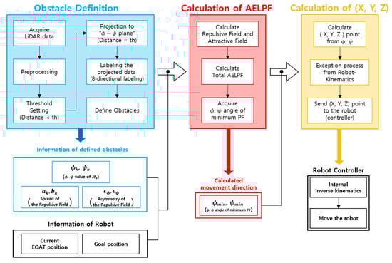 Future research will focus on enhancing the algorithm’s performance by considering various speed variations between the EOAT and complex obstacle environments. Additionally, we plan to explore methods for incorporating not only the EOAT but also other dynamic elements of industrial robots (e.g., joints, body, etc.) into the avoidance algorithm. Furthermore, we will investigate the feasibility of applying the AELPF algorithm to humanoid robots, taking into account articulated structures and dynamic movements. By optimizing obstacle avoidance strategies for humanoid robots, our goal is to improve adaptability in human–robot collaboration environments.