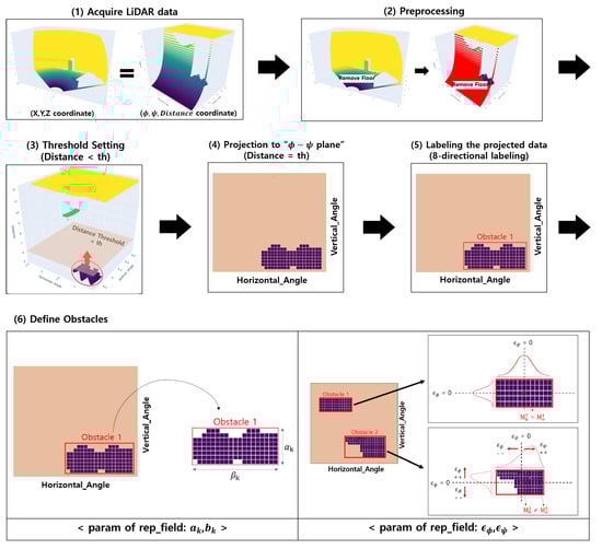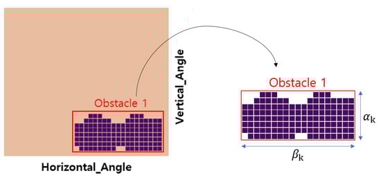 Data points representing nearby obstacles with a distance value smaller than the threshold () are projected onto a plane where . This projection transforms the 3D data into a 2D representation on the threshold plane. The resulting plane is treated as a single image, and eight-directional labeling, commonly used in computer vision, is applied to define individual obstacles [15]. Each pixel in this “image” corresponds to a projected data point, and the eight-directional connectivity is used to group and identify obstacle regions. Using the eight-directional labeling, obstacles are defined based on their spatial relationships, ensuring that neighboring data points are grouped together to form distinct obstacle clusters.