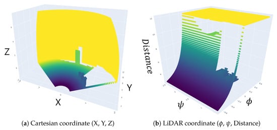 Let the Z value of the i-th point data from the LiDAR, after being converted to coordinates, be denoted as , and let the Z value of the current robot’s EOAT be denoted as . If , the corresponding LiDAR data are considered as part of the ground plane or noise and are subsequently removed (Steps (1)∼(2) of Figure 3). After this preprocessing, all subsequent procedures are conducted in the LiDAR coordinate system, represented by the axes (vertical angle), (horizontal angle), and distance. This approach is motivated by the fact that when the movement of robots primarily performing rotational motions or vehicles adjusting their steering angles aligns with the coordinate system of LiDAR data, collision avoidance algorithms can be designed more intuitively and efficiently. For a clearer understanding, refer to Figure 4, which represents the LiDAR data in two different coordinate systems.