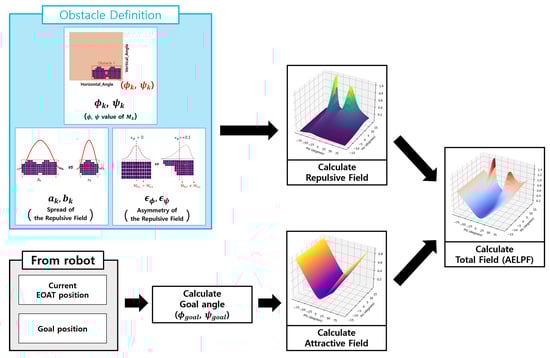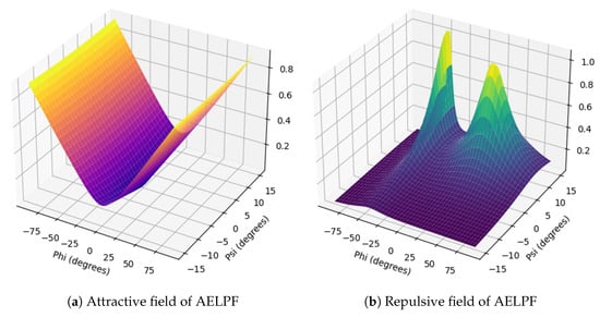 The repulsive field effectively repels the robot from obstacles based on both distance and angular deviation. The elliptical structure defined by and allows the repulsive field to dynamically adapt to obstacle shapes and orientations. Additionally, the inclusion of relative velocity in ensures that the field responds more strongly to fast-approaching obstacles, enhancing safety in dynamic environments. This formulation enables the AELPF method to provide a balanced and adaptive repulsive force, helping the robot navigate safely while maintaining responsiveness to its surroundings. And Figure 9 shows a graph of attractive and repulsive field of AELPF.