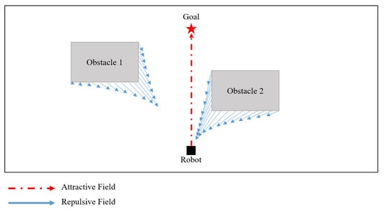 where is the attractive field guiding the robot toward the goal (see Section 2.2.1), and is the repulsive field pushing the robot away from obstacles (see Section 2.2.2).