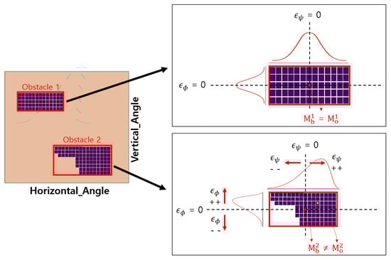 In the case of Obstacle 1, as illustrated in Figure 8, as the center point of Obstacle 1 () coincides with the center point of the bounding box for Obstacle 1 (), the asymmetry of the repulsive field is zero, implying that both and are equal to zero. Similarly, in the case of Obstacle 2, as the center point of Obstacle 2 () is located in the positive directions of and relative to the center point of the bounding box for Obstacle 2 (), both and will have positive values.