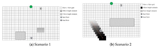 As shown in Figure 11a, Scenario 1 consists of a robot and two stationary obstacles of different sizes and heights, positioned in front of the robot along with predefined start and goal positions. In Scenario 2, shown in Figure 11b, one of the obstacles (100 cm in height) moves toward the Goal Point, introducing a dynamic element to the experiment. The LiDAR sensor, mounted on the EOAT of the robot, was used to acquire real-time obstacle position and direction information.