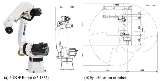 The LiDAR used in the experiment was Velodyne’s VLP-16 model, which has specifications as listed in Table 2. The robot was the S6-1835 model from HYRobotics, featuring six degrees of freedom, with specifications presented in Figure 12 [19]. The robot control library provided by the controller manufacturer was utilized for real-time position updates of all robot axes (A1∼A6). This enabled effective joint error dynamics control. Control commands for each axis were calculated to ensure that the maximum allowable angular velocity, based on the manufacturer’s motor specifications, was not exceeded.