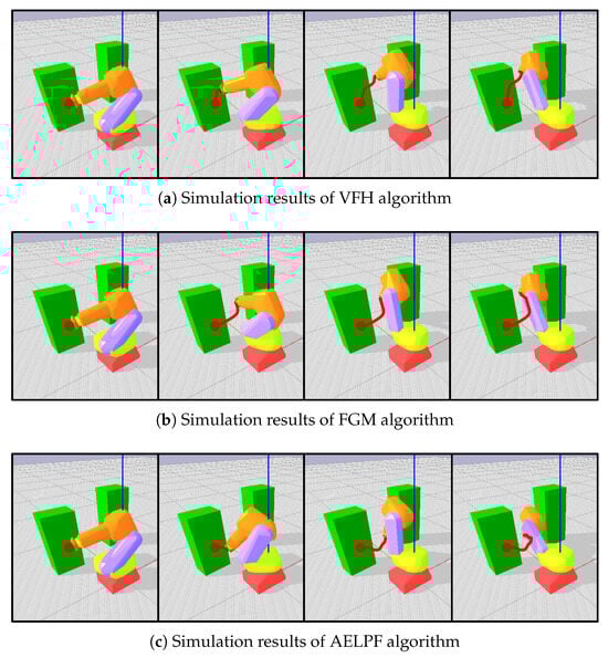 In this experiment, the obstacle avoidance performance of the AELPF algorithm was compared with the VFH (Vector Field Histogram) algorithm [17] and the FGM (Follow the Gap Method) algorithm [18]. These two methods are widely used path planning algorithms in industrial environments and have been extensively applied in industrial and mobile robots, making them standard approaches for real-time obstacle avoidance.
