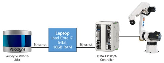 The experimental environment consists of a Velodyne VLP-16, an external computer, and a robot controller, which has specifications as listed in Table 3. The Velodyne VLP-16 LiDAR consists of a LiDAR sensor that generates 3D point clouds and an interface box module that transmits data via an Ethernet port. The data are sent to a laptop through the Ethernet connection. The robot’s movement coordinates, calculated by the AELPF algorithm on the PC, are transmitted to the robot controller, CP505/A, via the Ethernet connection (see Figure 14). Upon receiving the movement coordinates, the robot moves to the specified position under the control of the KEBA robot control system and updates the EOAT position in real time.