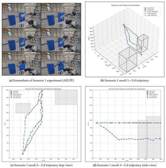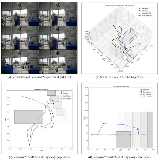 Additionally, we plan to conduct research on a multi-agent approach aimed at developing techniques for dynamically generating optimal paths to enable efficient collaboration between multiple robots in industrial environments. Furthermore, we will optimize the hyperparameters of the AELPF algorithm through reinforcement learning or genetic algorithms to enhance the algorithm’s stability and achieve more precise and reliable avoidance performance. Moreover, in future research, we will explore how to apply a more structured real-time control framework [20,21] to the AELPF, aiming to improve its responsiveness and adaptability in practical settings.