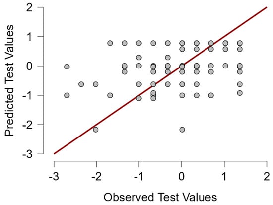 Figure 1 presents a scatterplot comparing the predicted test values of AI usage intention (AI_intention) generated by the Decision Tree Regression model with the observed test values. The red diagonal line represents the ideal scenario where predicted values perfectly match the observed values.