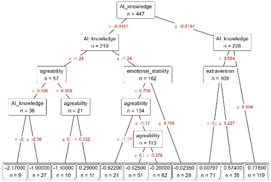In the left subtree, where AI_knowledge is less than −0.0187, a further split occurs at −1.244, refining the distinction among participants with lower levels of AI knowledge. Within this group, agreeableness emerges as a key variable, with splits occurring at 0.206 and 0.722, indicating its secondary importance in shaping AI usage intention for participants with limited AI knowledge. In contrast, the right subtree (AI_knowledge ≥ −0.0187) introduces extraversion as a critical variable, splitting at 0.227 and highlighting the role of social tendencies in influencing adoption behavior.