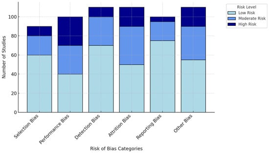 The risk of bias for the 141 included studies was evaluated using appropriate methodologies for different study designs. For randomized controlled trials (RCTs), the Cochrane Risk of Bias (RoB 2.0) tool was used to assess methodological rigor. For non-RCTs (e.g., quasi-experimental, observational, or retrospective studies), the Newcastle–Ottawa Scale (NOS) and the Joanna Briggs Institute (JBI) Critical Appraisal tools were employed to ensure a comprehensive quality assessment.
