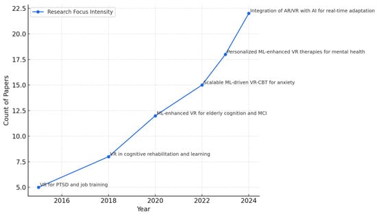 This systematic review integrates results from 141 studies to compare the incorporation of ML algorithms into AR/VR-based cognitive therapies for mental disorders. This research seeks to determine the effectiveness of AR/VR technologies in augmenting conventional cognitive therapies and investigate how ML can be utilized to tailor these therapies to cater to individual patients’ better needs. It also explores the predictive potential of ML models in patient outcome prediction and therapy optimization. Comparative analysis is drawn to identify the efficacy of AR/VR-based cognitive therapies over conventional methods. This paper also investigates the application of reinforcement learning (RL) and adaptive algorithms for enhancing therapeutic experience. It delineates the new technological innovations in ML and AR/VR confluence that revolutionize cognitive therapy. By exploring top trends, methodological advancements, and empirical evidence, this review demonstrates how AR/VR combined with ML can potentially enhance mental healthcare, ultimately leading to more effective, scalable, and personalized therapy [26,27].