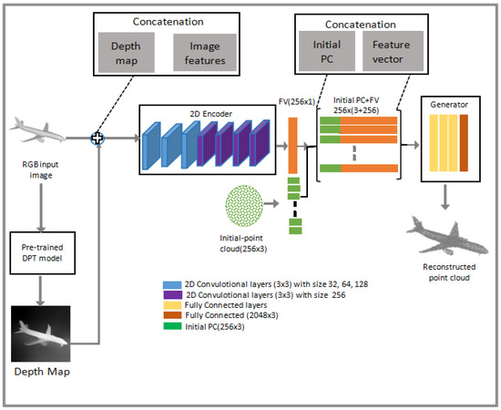 The initial methodologies in deep learning for 3D reconstruction utilized voxel-based representations employing 3D convolutional neural networks (3D-CNNs) [7,8]. These approaches, however proficient in modeling volumetric data, encounter considerable obstacles. Voxel grids are resource-intensive, require substantial memory, and possess restricted resolution. Furthermore, voxel grids encompass internal characteristics of objects that are extraneous for the majority of reconstruction tasks, rendering them wasteful and frequently resulting in unsatisfactory results [9]. The aforementioned limitations have catalyzed the creation of more efficient representations, such as point clouds, which directly sample points on the visible surfaces of objects, thereby capturing critical geometric data without superfluous overhead. Point cloud-based methodologies, including PSGN [10] and Pixel2Point [11], have exhibited the advantages of point clouds in representing intricate geometry. These technologies provide a streamlined and effective substitute for voxel grids. Nevertheless, obstacles persist. The irregular distribution of points and the failure to maintain intricate object characteristics persistently impede the quality of reconstructions generated by these methods. To address these constraints, we utilize the benefits of depth maps and preliminary point clouds. We compute depth maps utilizing a pre-trained depth estimation network known as DPT [12] instead of depending on costly depth cameras. These estimated depth maps represent the relative distances of object surfaces, offering valuable geometric information essential for deducing 3D structures. In contrast to RGB photographs that solely convey appearance information, depth maps directly depict the third dimension, aiding in the resolution of ambiguity regarding object shapes. This is especially helpful in situations where spatial relationships are ambiguous due to occlusions or perspective distortions [13]. Initial point clouds enhance depth maps by acting as a structural prior, offering a foundational geometric depiction of an object. The starting point cloud, usually depicted as a uniform spherical distribution, directs the reconstruction process to generate uniformly dispersed points on the object’s surface. This guarantees the preservation of finer details and helps the resulting point cloud closely match the actual shape of the object, even when input data are sparse or unclear [11,14].
