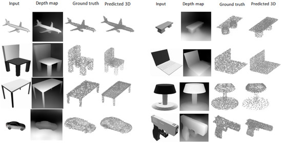 The proposed model is evaluated in comparison to 3D-LMNet and Pixel2Point utilizing the ShapeNet dataset, maintaining identical training data and evaluation conditions to ensure fairness. The results presented in Table 3 indicate that the proposed model surpassed existing state-of-the-art methods across various metrics. The model demonstrated superior performance in 9 of 13 categories when evaluated with the Chamfer Distance, outperforming 3D-LMNet, and in 10 of 13 categories compared to Pixel2Point. In a similar evaluation using Earth Mover’s Distance (EMD), the proposed model exceeded the performance of 3D-LMNet across all 13 categories and outperformed Pixel2Point in 11 categories. The metrics highlight the model’s accuracy in producing point clouds that closely align with the ground truth. In certain categories, alternative models demonstrated superior performance compared to DepthCloud2Point. The evaluation metrics further underscore the advantages of our approach. Earth Mover’s Distance (EMD), measures point-to-point correspondence and penalizes mismatches. This metric highlights the high quality of our model’s reconstructions, as they exhibit better alignment with the ground truth and successfully capture intricate object details.