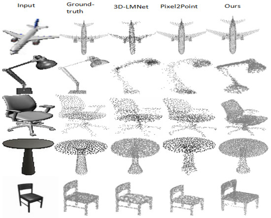 Dataset: The approach proposed in this paper is evaluated on the ShapeNet [30] dataset and Pix3D [31] dataset. The ShapeNet dataset is a substantial, synthetic 3D dataset widely employed in 3D research, encompassing 3D model retrieval and reconstruction. It is an assemblage of 3D forms, depicted as textured CAD models categorized semantically. In our experiment, we specifically utilize the ShapeNetCore dataset, a refined and aligned subset of the ShapeNet dataset. This sample includes more than 50,000 distinct 3D models across 55 prevalent object categories. Every model has 24 photos captured at fixed angles. We concentrate on 13 categories and employ the 80%–20% train–test division as specified by [30]. The Pix3D dataset comprises 7656 authentic photos along with associated metadata, including masks, ground truth CAD models, and position information. Pix3D is a publicly accessible dataset comprising matched pairings of real-world images and 3D models. It encompasses significant diversity in item shapes and backdrops, presenting considerable challenges. We evaluate and report the efficacy of the suggested technique on the chair, sofa, and table categories from the Pix3D dataset.