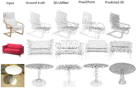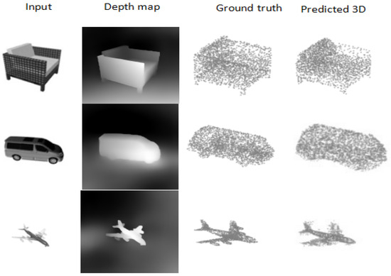 Baselines: The DepthCloud2Point model was evaluated on both synthetic and real-world data, and it was trained using the ShapeNet dataset. An ablation study has shown that depth maps and initial point clouds substantially enhance reconstruction accuracy, enabling the model to generate high-quality 3D point clouds from input images. The superior performance of the proposed model was corroborated through comparisons employing Chamfer Distance and Earth Mover’s Distance against leading approaches, including 3D-LMNet [15] and Pixel2Point [11]. Moreover, experiments conducted on the Pix3D dataset demonstrated that the model surpassed existing methods regarding generalization across diverse real-world images.