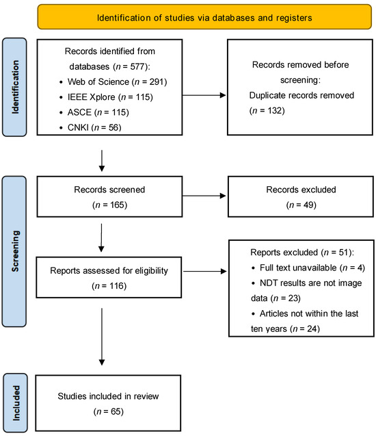 We systematically searched four databases, namely, Web of Science, IEEE Xplore, ASCE, and CNKI, using keywords such as “deep learning”, “nondestructive testing”, “building inspection”, “concrete deterioration”, and “image processing”. Initially, we obtained 547 articles. After eliminating duplicates, early publications, and the irrelevant literature, the remaining literature was screened and evaluated in full text. The studies were finally determined to be included in the systematic review. The flow chart of the PRISMA method is shown in Figure 1.