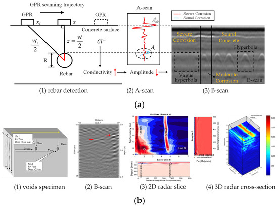 Ground-penetrating Radar (GPR) technology has demonstrated its unique application advantages in many key engineering fields, such as pavement defect detection, bridge quality assessment, railway monitoring, and tunnel lining inspection [18,19,20]. The technology generates detailed images of underground structures through the propagation and reflection of high-frequency electromagnetic waves in the medium, providing intuitive information about the structure’s interior. In the GPR image, the scattering hyperbolic vertices become the key indicators to accurately mark the location of the target object, and this feature greatly enhances the ability of engineers to judge the location of various defects or objects inside the structure. In the inspection of concrete structures, GPR not only accurately locates reinforcement bars and evaluates corrosion conditions [21,22], but also effectively reveals cracks, leaks, grouting defects, voids and other internal defects [23,24], while assisting in the measurement of material delamination and the thickness of the protective layer. The basic principle and images of GPR inspection are shown in Figure 4 [22,25]. To meet various depths of detection requirements, high-frequency antennas, with their high-resolution advantage, become the preferred choice for detecting subtle objects (such as defects and reinforcement bars) in concrete, road, and bridge surface structures. Although low-frequency antennas have slightly lower resolution, they can penetrate deeper into the ground and provide valuable information for deep structure detection [26].