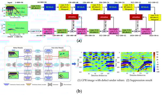 With the advancement of image processing technology, researchers have been exploring ways to improve the accuracy of GPR data analysis. Dinh et al. [27] effectively reduced false anomalies by combining traditional processing techniques, such as image migration, with CNN automation algorithms, but the algorithms require a large amount of training data and do not apply to all types of bridge coverages. Subsequently, Liu et al. [28] introduced migration learning to optimize SSD model training, which alleviated the dependence on a large amount of training data. However, in terms of quantitative rebar size detection, it is difficult to achieve the required accuracy standard by directly assessing rebar size from GPR images. For this reason, Chang et al. [29] achieved quantitative detection of rebar radius within 7% error by constructing an electromagnetic physical model considering rebar radius. Many factors can affect the detection results of ground-penetrating radar (GPR). For example, the thickness of the overlay, the moisture content in the structure, and the spacing of the rebar all have an impact on the GPR signal. It is worth noting that the strong reflectivity of metallic materials leads to a shielding effect of the reinforcement layer in the concrete on the GPR signals, masking the echoes of the damage under the reinforcement and making it difficult to accurately identify the damage signals. This shielding also complicates the detection of steel pipe grouting compactness, making it challenging to assess the integrity of such structures using GPR alone. Focusing on the interference problem of steel reinforcement in defect detection, Wang et al. [30] designed a deep neural network integrating a spatial attention module and a residual starting block, as shown in Figure 5a, aiming to strengthen the network’s ability to identify weak defect signals and achieve an accurate reconstruction of multiple defect reflections. With this design, the rebar signals in the GPR image were effectively filtered out and the echoes of the defects under the rebar layer were enhanced, which improved the recognition accuracy from 0.208 to 0.850. After that, they proposed an unsupervised rebar clutter suppression model based on CycleGAN by combining the contrast feature encoder and similarity feature encoder to address the problem of fewer images in the actual project, as shown in Figure 5b, which effectively reduces the misdetection and omission of the defect [31].