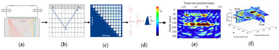 Underlying operating process of array ultrasound: (a) array ultrasound signal emission and reception [35]; (b) time domain signal acquisition [35]; (c) 66 unrelated A-scans [35]; (d) coherent summation and color assignment [35]; (e) single B-scan; and (f) panoramic B-scan, C-scan, and D-scan [36]. Reproduced with permission from Ref. [35]. Copyright 2024 Elsevier. Reproduced with permission from Ref. [36]. Copyright 2018 Elsevier.