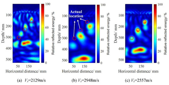 Ultrasonic inspection methods are widely used in thickness measurement, delamination detection, and the detection of concrete members, tunnel linings, under-pavement voids, and reinforcing steel by the analysis of ultrasonic propagation characteristics in the medium, such as reflection, refraction, and scattering phenomena [32,33,34]. Combined with advanced imaging techniques such as synthetic aperture focusing technology (SAFT) (shown in Figure 6 [35,36]), ultrasonic transverse wave tomography (USWT) [33], and the total focusing method (TFM) [37], ultrasonic inspections can acquire high-resolution image datasets, which greatly facilitates the accurate identification of defects. During ultrasonography, the adjustment of parameters affects the accuracy of imaging, among which the physical parameter of wave velocity is crucial for the depth accuracy of internal defect localization [36]. Figure 7 [38] shows the imaging effects at different wave speeds.
