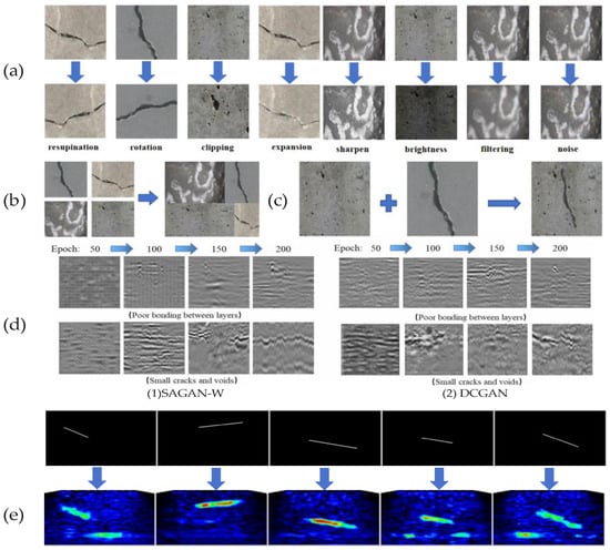 Meanwhile, the rise of Generative Adversarial Networks (GANs) has injected new power into the field of data enhancement. GANs are capable of generating realistic synthetic data through adversarial training of generators and discriminators. Among them, Deep Convolutional Generative Adversarial Network (DCGAN), as a variant of GAN, combines the variational auto coder (VAE) and Adam optimizer, which is successfully applied to generate realistic asphalt pavement crack images, effectively alleviating the constraints of sample scarcity on model training [71]. To deal with the collapse problem of DCGAN and the limitation of convolutional GAN in generating complex geometric patterns, Liu et al. [72] designed the self-attention mechanism of Self-Attention Generative Adversarial Network-W (SAGAN-W), which generated GPR images with clear hyperbolic curves and could simulate the true backscattering characteristics of defects. In addition, Yang et al. [35] developed a Conditional Generative Adversarial Network (CGAN) variant for generating ultrasound B-scan images that was trained using real B-scan images and their corresponding truthful image data, thus improving the generalization ability of the model.