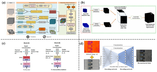 Multimodal data fusion technology breaks through the limitations of traditional isolated data processing by extracting visual attributes from data from different sensors and achieves a more comprehensive information feature system construction [84]. Currently, deep learning-based fusion methods mainly include frameworks such as Autoencoder, Convolutional Neural Networks (CNNs), and Generative Adversarial Networks (GAN). M2FNet, as an innovative multimodal fusion network, combines the local feature extraction capability of CNNs with the global characterization capability of Transformer through its dual-network architecture, extracts features from the raw signal data and B-scan and top-scan GPR image data, and achieves multimodal feature fusion through the cross-attention mechanism, which significantly improves the learning ability of GPR data [80], as shown in Figure 11a. Meanwhile, aiming at the comprehensive detection of metal internal and surface defects, the multi-modal automatic defect detection (M-ADR) system constructed by the fusion of ultrasonic and pulsed thermal imaging (PT) data via coordinate transformation technology realizes the optimization of defect identification and characterization, as shown in Figure 11b, and the detection accuracy rate is up to 91.46%, far exceeding the traditional model and single-mode technology [85]. For the fusion of infrared and visible images, Faegheh et al. [86] proposed the EFASPP U-Net deep network, consisting of two independent encoders (dealing with visible and thermal images, respectively) and a decoder, which combines a standard convolutional layer with a null convolutional layer to achieve feature-level fusion and avoid the loss of information for small targets. Figure 11c shows the block combining the visible and thermal feature maps. In addition, Wang et al. [13] used GAN’s Infrared–Visible Image Fusion (IVIF) technology and relied on the Resnet generator (as shown in Figure 11d) and PatchGAN discriminator to integrate thermal imaging and visual information, and built a deep neural network to achieve efficient case segmentation of building facade defects (cracks, spalling, etc.) in IVIF images.