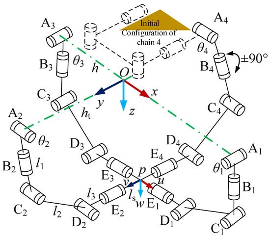 (b) Branch chain 4 is unfolded so it can move to the position of point E4 by setting the joint function in the joints A4, C4, and D4.