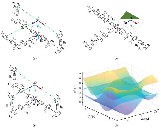 The above results are obtained by observing Equation (7), but all the position information of singularity in the process of mechanism motion can be obtained with an analytical method. Figure 3d shows the value corresponding to the determinant |Jx1| = 0 that corresponds to the rotary angles α and β when the position z of the operating object is given. It can be observed from Figure 3 that the configurations correspond to three branch links that are coplanar with the moving platform. This results in uncontrolled DOFs and an uncertain motion in the following motion process.