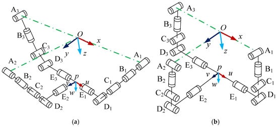 Firstly, it is assumed that the mechanism can complete rotary operations around the x- and y-axes and movement operations along the z-axis for the operating object. Its operation mode can be expressed using the motion set method [24,25] as M = (0 0 Tz; Rx Ry 0). Therefore, the intersection of the end motion forms of each branch chain should be M, where , (i = 1, 2, 3). Tz represents the moving platform’s movement along the z-axis, and Rn (n = x, y) represents the moving platform’s rotation around the n-axis.