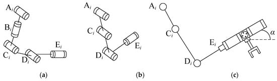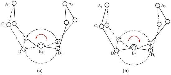 Similarly, when any column in Jx1 is zero, the determinant |Jx1| becomes zero. By observing Equation (7), it can be seen that, when θ1, θ2, and θ3 are 90° at the same time, the elements in the first column are zero, and their corresponding configuration is shown in Figure 3c. Secondly, when there is a linear correlation between rows or columns, the mechanism is also in a singularity. When members D1E1 and D3E3 are collinear and coplanar with members C2D2, the first column of the matrix Jx1 has a linear correlation with the third column. Due to the symmetry of the mechanism, the singularity of the branch chain is the same as that of branch chain 2 in other modes.