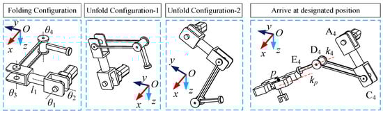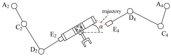 In the second stage of the working process, when branch chain 2 moves to singularity, branch chain 4 unfolds and moves to the designated position and then connects with the operating object. Branch chain 2 and the operating object are folded in the designated area after being released, as shown in Figure 9. It can be divided into two motion processes. Branch chain 4 first moves to the position adjacent to the operating object, that is, position E4, and keeps the slope of D4E4 the same as the slope of the operating object at the rotary angle α, as shown in the AiCiDiEi configuration in Figure 10. Then, point E4 is positioned through each driving joint so that branch chain 4 is connected to the operating object.