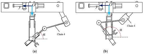 (a) When the rotary angle of the mechanism is α = 48.5°, that is, when branch chain 2 moves to singularity, the rotary movement stops.