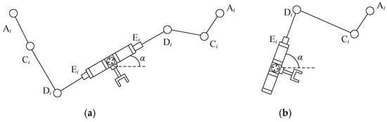 Typical configurations in inverse kinematic singularity position. (a) A2C2 and C2D2 are straight and collinear; (b) AiCi and CiDi are straight and collinear.