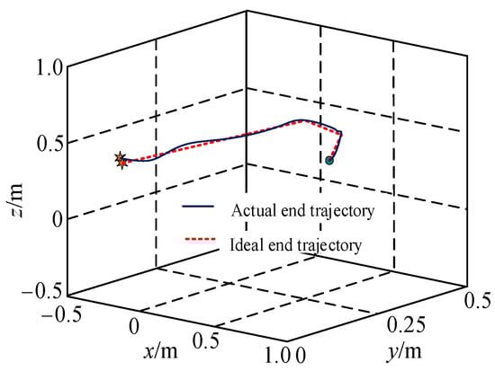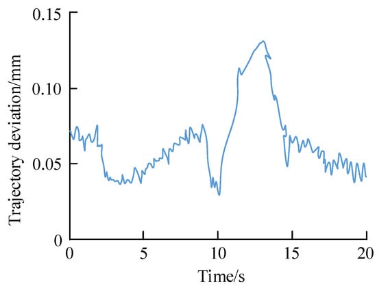 The unfolding process of branch chain 4 is simulated. When branch chains 1, 2, and 3 and the operating object move to singularity, branch chain 2 is separated from the operating object, and branch chain 4 is unfolded and connected to the operating object to continue the operation task. The starting position and target point of branch chain 4 are set in the folding process: the starting position PE0 = {0.1, 0.3, 0.05} of the branch-chain end point E4, and the target position PE = {0.06, 0, 0.48}, in m. The rotary angle of the operating object is 48.5°. The simulation running time is T = 20 s, the interpolation period is ΔT = 5 ms, the maximum linear velocity is Vmax = 0.05 m/s, and the maximum rotary speed is Ωmax = 22.918°/s. The translation position error compensation coefficient is βt = 300, and the rotary position error compensation coefficient is βr = 100. Figure 14 shows the ideal end trajectory and the actual end trajectory of the branch-chain end point in the switching process, and the trajectory deviation is shown in Figure 15. Figure 16a,b show the joint variation curves of branch chains 1 and 2 before singularity, respectively. Branch chains 3 and 1 are symmetrically arranged, and their trends are consistent. Figure 16c shows the variation curve of each joint during the unfolding movement of branch chain 4 to the target position.