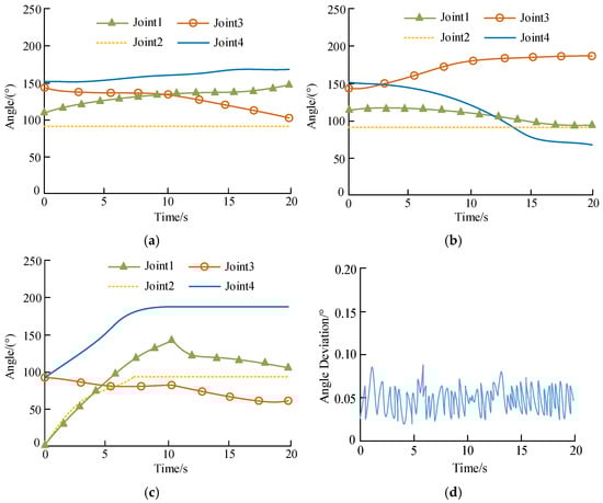 Variation curve of joint angle of each branch chain: (a) articular angle in branch chain 1; (b) articular angle in branch chain 3; (c) joint angle in branch chain 4; (d) angle deviation.