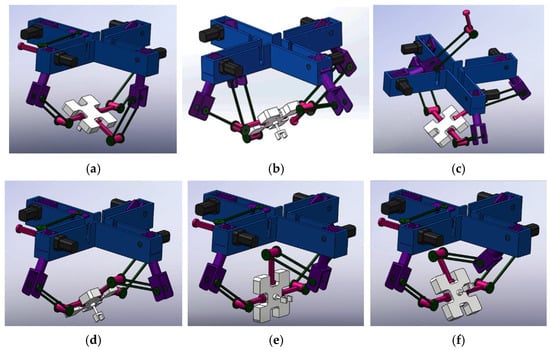Several typical singularities of the mechanism are introduced. From the above results, it can be seen that, if the mechanism realizes the operation of a large rotary angle, the biggest limiting factor is the singularity of the branch chain, as shown in Figure 5. Figure 6 shows that the mechanism rotates the operating object through chain 1 and chain 3; when the mechanism moves to the inverse kinematics singularity, branch chain 4 is unfolded to connect with the operating object, and branch chain 2 is released from the connection with the operating object, so that the operating object can continue to rotate, thus realizing the large-rotary-angle operation.