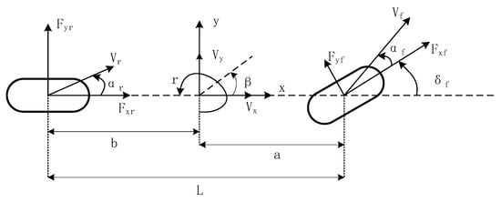 where m is the vehicle mass, vx and vy are the longitudinal and lateral velocities of the vehicle’s center of mass in the coordinate system, L is the wheelbase, a and b are the distances from the vehicle’s center of mass to the front and rear axles, respectively, Iz is the moment of inertia of the vehicle about the z-axis, Fyf and Fyr are the resultant lateral forces acting on the front and rear axles of the vehicle, respectively, Fxf and Fxr are the resultant longitudinal forces acting on the front and rear axles of the vehicle, respectively, and Ff represents the resultant resistance force acting on the vehicle in the longitudinal direction.