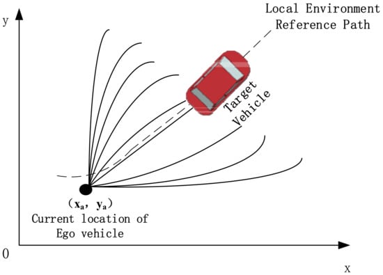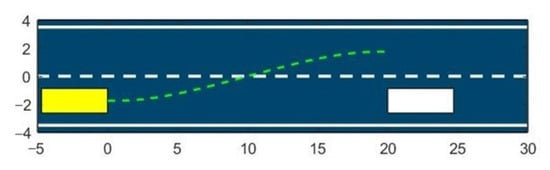 To ensure that the autonomous vehicle achieves higher accuracy in path tracking during lane-changing overtaking maneuvers on highways with dual-lane scenarios and to smooth its motion trajectory, we employ a path-planning algorithm based on fifth-order polynomials within the controller, implemented using Matlab–Simulink. This approach transforms the problem into finding a curve that connects two specified target points (current position and target position) while satisfying requirements such as fixed desired velocity, acceleration, and heading angle at the target points, as illustrated in Figure 4.
