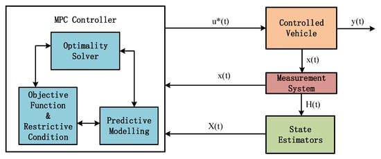The principal block diagram of MPC is shown in Figure 6, consisting of three modules: the MPC controller, the controlled vehicle, and the state estimator. In this diagram, the MPC controller integrates the predictive model with the objective function and constraints to solve an optimization problem, obtaining the optimal control sequence u*(t) at the current time. This control sequence is then applied to the controlled vehicle, which adjusts to the current control inputs and outputs the optimal front wheel steering angle, y(t). The state variable x(t), which is observed through the measurement system, will be directly input into the MPC module, while the state quantity H(t), which cannot be directly observed or is too costly to measure, is estimated through an estimator. The estimated state quantity X(t) is then fed back into the MPC controller, which performs another optimization to obtain the control sequence for the next time period.