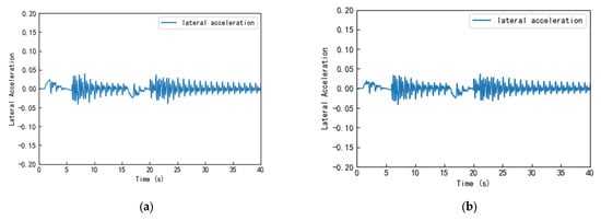 Additionally, we analyzed the vehicle’s lateral acceleration, as shown in Figure 8, to evaluate the control system’s effectiveness in managing the vehicle’s lateral motion. From the lateral acceleration versus time curve, it can be seen that during the 40 s of experimental simulation, the vehicle exhibited significant lateral acceleration fluctuations only at the 5th and 20th seconds. These fluctuations occurred because the vehicle had just completed lane changes and needed to process new lane road environment information and behavior predictions. For the rest of the time, the lateral acceleration remained nearly zero, indicating that the vehicle could smoothly complete the double-lane-change maneuver.
