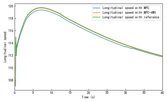 In addition, Figure 9 compares the longitudinal velocity profiles of the single MPC controller, the proposed MPC-4WS hybrid controller, and the reference. Overall, both controllers track the reference velocity with minimal deviation. However, the MPC-4WS method has a slightly faster acceleration phase and is able to converge back to the target velocity more smoothly after reaching the peak. This suggests that the hybrid MPC-4WS controller not only facilitates lateral stability but also contributes to more responsive longitudinal control, especially during high-speed maneuvers. In contrast, the single MPC method suffers from a small delay in matching the reference value and a slightly higher steady-state error. As a result, the MPC-4WS hybrid controller excels in maintaining longitudinal speed accuracy and stability under demanding driving conditions.