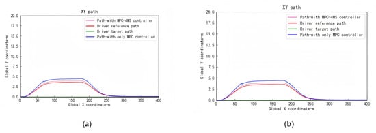 To evaluate the accuracy and stability of the proposed control strategy’s path-tracking system, we compared the relative proximity of the vehicle’s XY driving path curves to the reference path over a 400 m distance using both the MPC controller and the MPC-4WS hybrid controller. The experimental results, shown in Figure 10, indicate that the control and path-tracking performance of the designed MPC-4WS hybrid controller are superior to those of the standalone MPC controller.