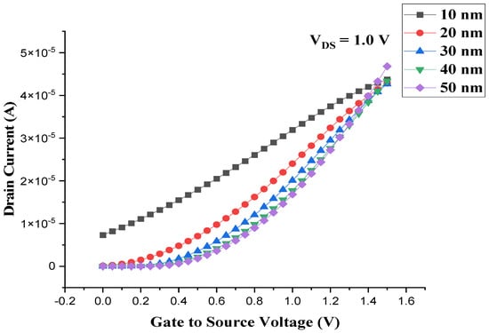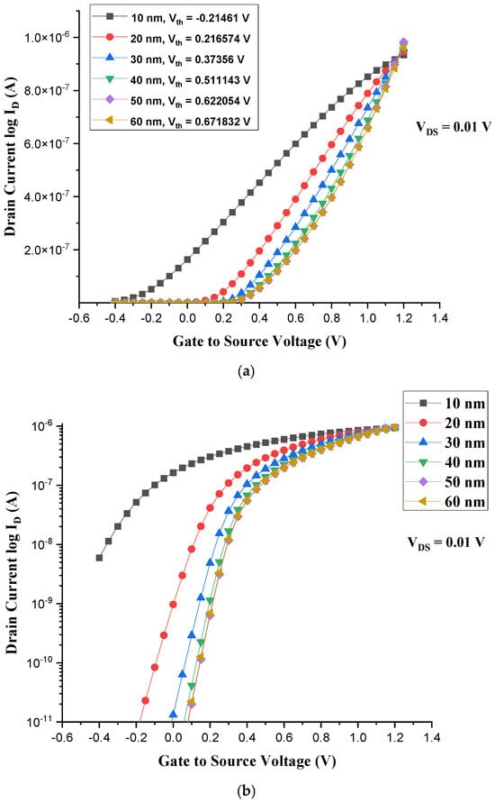 The characteristics and results of a silicon-based CGAA-JLFET show the behavior of the drain current as a function of the gate-to-source voltage (VGS). The transfer curve of a JLFET often rises sharply above when VGS crosses the threshold voltage (Vth) and then saturates in the on state. This device has a steep subthreshold slope, showing that switching is efficient. As we decrease the channel length, SCEs arise, which force the threshold voltage (Vth) to drop; hence, it is more sensitive to a change in VDS. As a result, leakage current increases, and the ION/IOFF ratio decreases, leading to compromised device switching efficiency []. Compared to other inversion devices, SCEs are less common in JLFETs. Equation (1) explains how the space charge area connected to the junctions (designated as SCE in Equation (1)) and the expansion of the drain space charge region with drain voltage (designated as DIBL in Equation (1)) cause the threshold voltage to decrease in the junction or other conventional devices.
