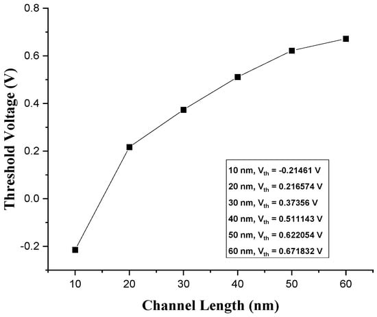 The research analyzes performance metrics and material assessments between cylindrical GAA-JLFETs. Figure 2a presents the simulated transfer characteristics of CGAA-JLFET for different channel lengths ranging from 10 nm to 60 nm, and P+ polysilicon has been used to fulfill the requirement of a high gate work function to achieve an appropriate Vth value. The threshold voltage value decreased as the channel length decreased, as shown in Figure 3. These ID-VGS characteristics of the CGAA-JLFET have been plotted at VDS = 0.01 V, spanning a range of VGS from −0.4 to 1.2 V. The threshold voltages for different channel lengths have been observed to be Vth = −0.21461 V (at 10 nm), 0.216574 V (at 20 nm), 0.37356 V (at 30 nm), 0.511143 V (at 40 nm), 0.622054 V (at 50 nm), and 0.671832 V (at 60 nm).