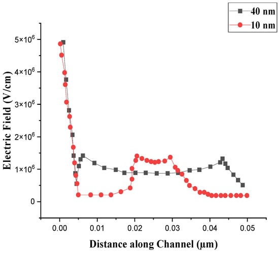 Figure 4 shows the plot of the electric field distribution versus the distance from the gate electrode along the nanowire for 10 nm and 40 nm CGAA-JLFET, respectively. Scaling and SCEs significantly differ in electric field distribution for a 10 nm and 40 nm CGAA-JLFET. When scaled to a 10 nm channel length, the electric field across the channel is highly concentrated near the source and drain regions, where the variations are sharp due to the strong DIBL and punch-through effects. Because of this scale, however, the gate electrostatic control becomes weak, resulting in a non-uniform electric field at the channel ends where the field is higher. However, for the case of the 40 nm channel length, the electric field distribution is uniform over the channel compared to that of the 10 nm channel, with smaller SCEs. The gate-to-channel electrostatic coupling is stronger, allowing better channel control. In both cases, the CGAA-JLFET structure helps overcome some of the SCEs by providing better gate control on the channel, but as the channel length reduces, the field becomes localized, and device performance becomes more dependent on higher leakage currents and switching efficiency [].
