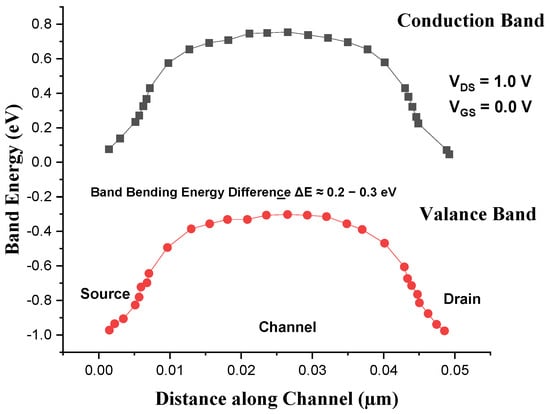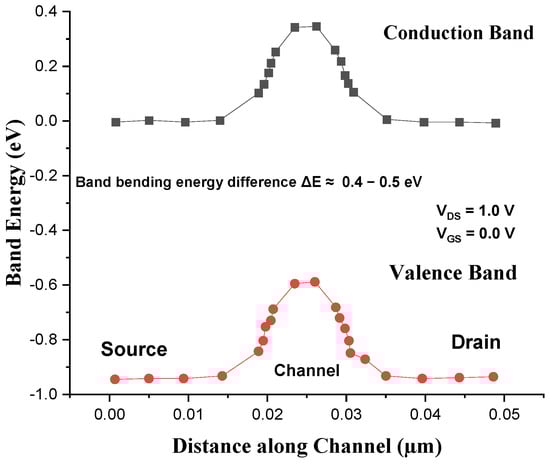 Energy band profiles were taken at a cutline 1 nm below the Si-SiO2 interface of 10 nm Si-based CGAA-JLFET.