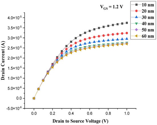 Figure 8 illustrates the ID-VDS characteristics of the CGAA-JLFET at VGS = 1.2 V, with VDS ranging from 0 to 1 V for different channel lengths. This device demonstrates a high ON-state current and a low OFF-state current, showcasing excellent electrostatic control, with a maximum drain current of 3.74606 × 10−5 A (at 10 nm), 3.23924 × 10−5 A (at 20 nm), 2.95 × 10−5 A (at 30 nm), 2.76015 × 10−5 A (at 40 nm), 2.720923 × 10−5 A (at 50 nm) and 2.698054 × 10−5 A (at 60 nm). The saturation slope is about to 6.43265 × 10−6 A (at 10 nm), 4.07531 × 10−6 A (at 20 nm), 3.1868 × 10−6 A (at 30 nm), 3.15754 × 10−6 A (at 40 nm), 3.10029 × 10−6 A (50 nm), and 3.05913 × 10−6 A (at 60 nm). It can be understood here that the maximum drain current and saturation slope increase as channel length decreases. As the technology scales down during different nodes (10, 20, 30, 40, 50, and 60 nm), the output characteristics of the silicon-based CGAA-JLFET follow key trends. With smaller nodes (10–30 nm), electrostatic control improves, SCEs are reduced, and the SS steepens, leading to higher current drivability and lower leakage. On the other hand, larger nodes (40–60 nm) suffer from more severe SCEs, such as threshold voltage roll-off and higher leakage currents, resulting in reduced performance efficiency. The drain current is proportional to the gate voltage, and the devices have typical saturation behavior, with smaller nodes controlling these effects better.