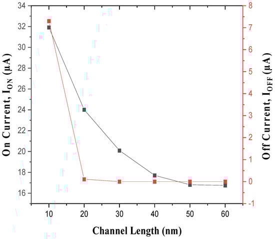 The cylindrical gate architecture delivers better electrostatic performance than planar and FinFET structures, thus making it highly successful in reducing SCEs. Full gate enclosure in CGAA-JLFETs allows for uniform electric fields that minimize DIBL and enhance SS, as they overcome the charge-sharing restrictions experienced in FinFETs. The elevated gate-to-channel capacitance enables better charge confinement, stopping threshold voltage from degrading too extensively at small device dimensions. This section provides a quantitative evaluation of the SCE reduction capability of the cylindrical structure across different channel lengths and materials. Figure 9 illustrates the on-current and off-current variations of Si-based CGAA-JLFET with different channel lengths []. Mathematical expressions for SS and DIBL are explained in Equation (2) and Equation (3), respectively: